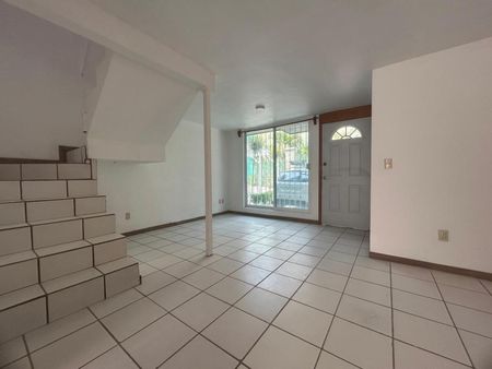 Casa habitación de tres niveles en condominio privado "Los Abobes", tres recámaras (dos con clóset en planta alta y una de ellas en planta baja sin closet), estudio o area ideal para fitness o yoga, dos baños completos, área de sala-comedor, cocina integral con estufa, área de lavado, patio trasero, tanque de gas estacionario y cochera para un auto.