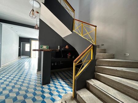 Inmueble de tres niveles ideal para pequeño Hotel, local comercial al frente con terraza en acceso principal, área de " hoteleria " con recepción, ocho recámaras o privados, amplia área de trabajo, terraza trasera, terraza al aire libre en azotea, cocina y cuarto de servicio o bodega en sótano.
