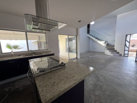 Cocina integral con isla y dos recámaras en planta baja, una con baño y la otra cuenta con preparación para instalar baño.