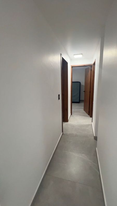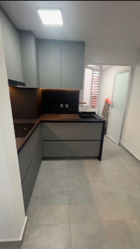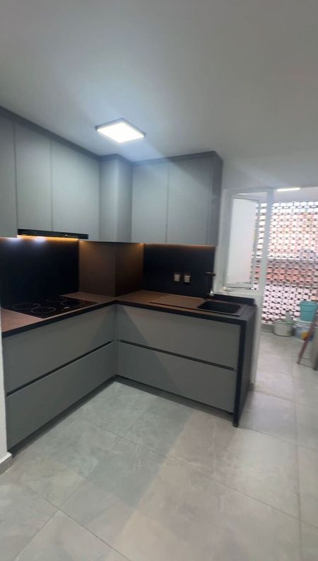 * Acabados visibles: Pisos de cerámica en tono gris claro, cocina integral con gabinetes en gris y detalles en madera, y un baño con cancelería de vidrio.