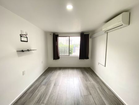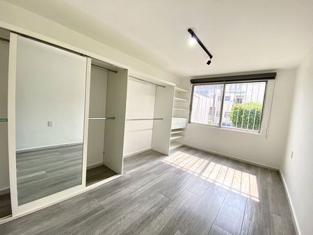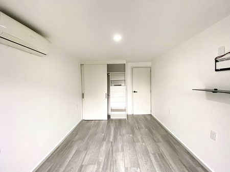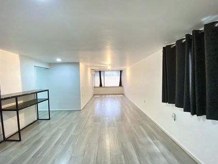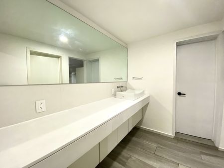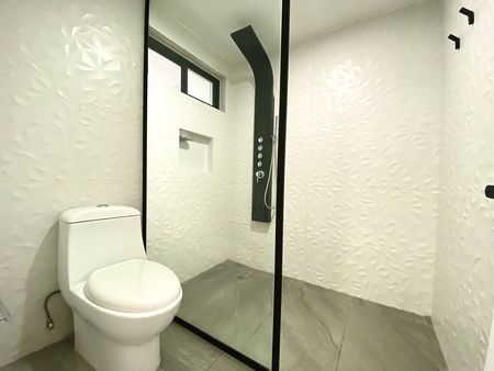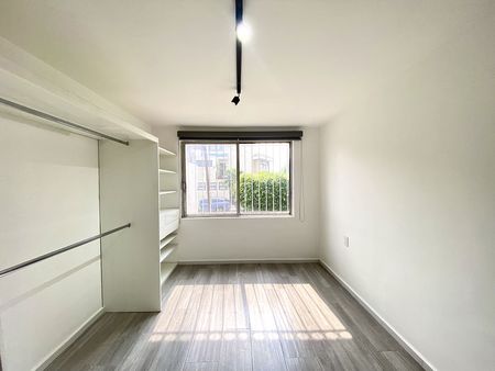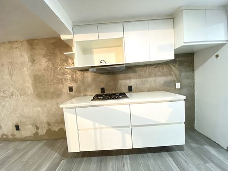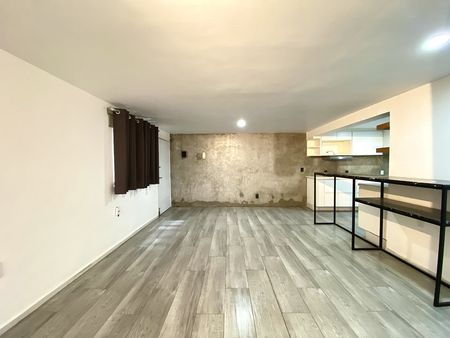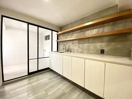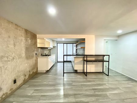 Departamento en primer piso, dos recámaras con clóset, la principal con aire acondicionado, un baño completo, área de sala-comedor con aire acondicionado, cocina integral con estufa, campana y tarja con filtro de agua, patio de servicio y lavado techado y estacionamiento para dos autos en batería. el departamento cuenta con interfón y cortinas/persianas.