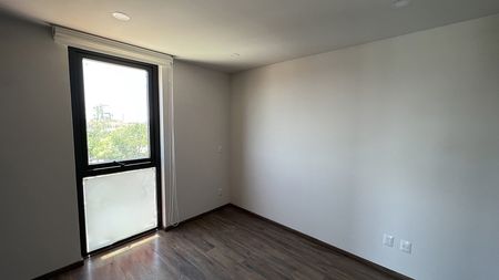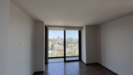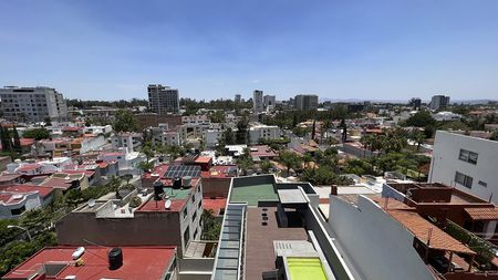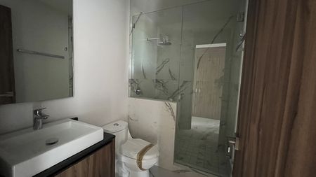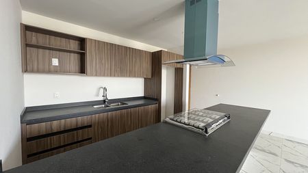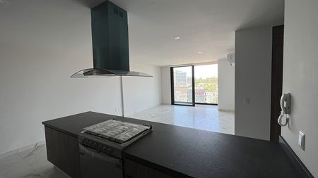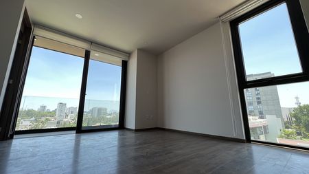 Departamento en quinto piso, dos recámaras con clóset, dos baños completos, cocina integral con barra desayunador tipo isla, estufa, campana y tarja, área de sala-comedor, balcón y cuarto de lavado. (Aire acondicionado en sala, recámaras y persianas tipo black out) . Lobby con vigilancia, terraza, alberca, área de camastros, regaderas, área de juegos infantiles y gimnasio.