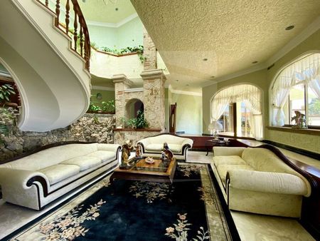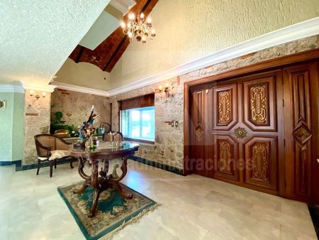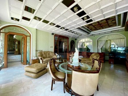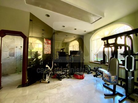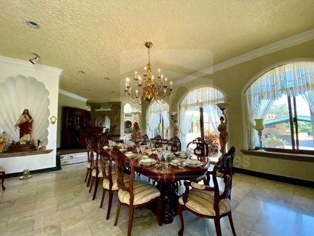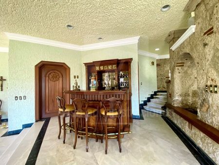 TERCER NIVEL: Recibidor, ingreso principal con fuente de cantera, cochera para 14 autos, (cuatro techados), sala a desnivel, medio baño de visitas, comedor con salida a terraza, terraza desayunador, antecomedor, cocina integral, cuarto de servicio con baño y área de lavado, cuarto de visitas con baño completo, cuarto de juegos, gimnasio con ducha y sauna.