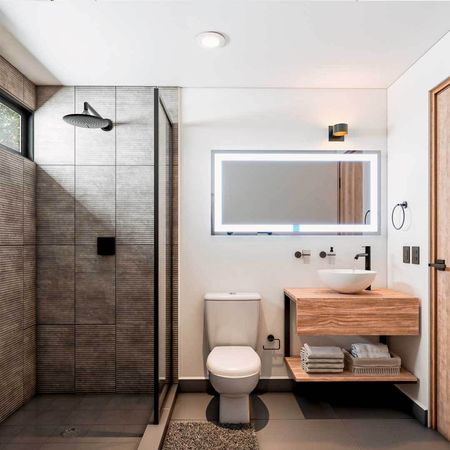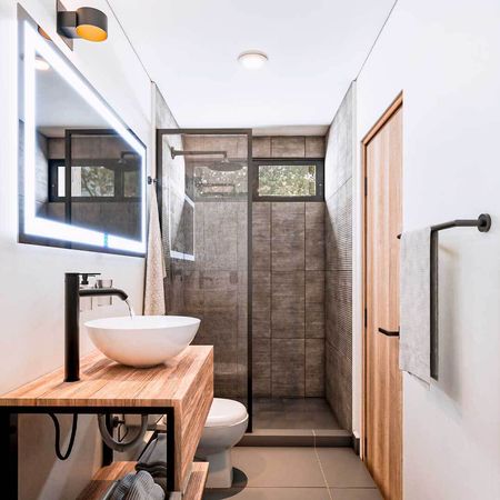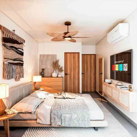 El Modelo Almonte Grand cuenta con sala comedor con terraza, cocina integral con cubierta de granito, área de lavado, baño de visitas, 2 recámaras, la principal con vestidor y baño completo y la secundaria con closet y baño completo, y 2 espacios de estacionamiento. Es un proyecto que combina diseño y elegancia con espacios abiertos e iluminados.