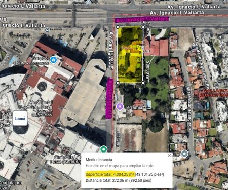 Presentamos un magnífico terreno sobre la emblemática Avenida Vallarta, una de las arterias viales más importantes y con mayor flujo de la ciudad, estratégicamente ubicado a un costado del reconocido centro comercial "La Gran Plaza Fashion Mall".